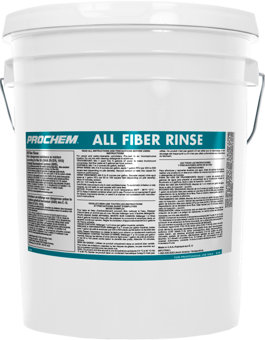 Prochem's All Fiber Rinse (liquid) is our premier multi-purpose acidic extraction rinse. Features premium-grade ingredients that emulsify and remove soils and prespray residues that others leave behind, while safe organic acids neutralize alkalinity and leave fibers bright and luxuriously soft to the touch while inhibiting bleeding, dye migration, browning and soil wicking. Use it to stabilize dyes on most fabrics, area rugs and other textiles. Also effective as a urine neutralizer: apply as a post-mist or use as part of a deep saturation and sub-extraction decontamination process.